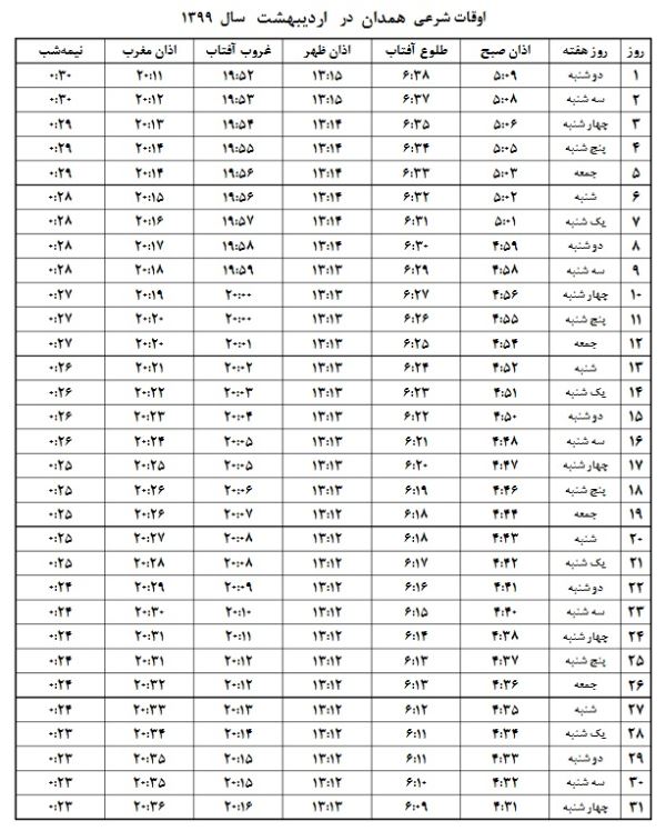اوقات شرعی ماه رمضان ۹۹ همدان: