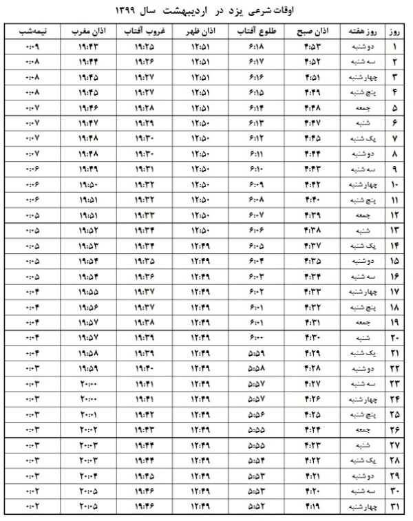 اوقات شرعی ماه رمضان ۹۹ یزد: