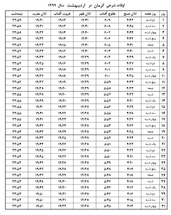 اوقات شرعی ماه رمضان ۹۹ کرمان: