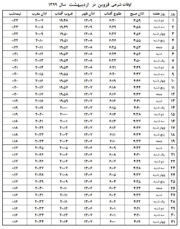 اوقات شرعی ماه رمضان ۹۹ قزوین: