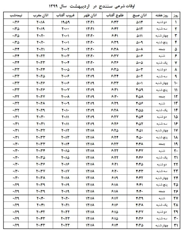 اوقات شرعی ماه رمضان ۹۹ سنندج: