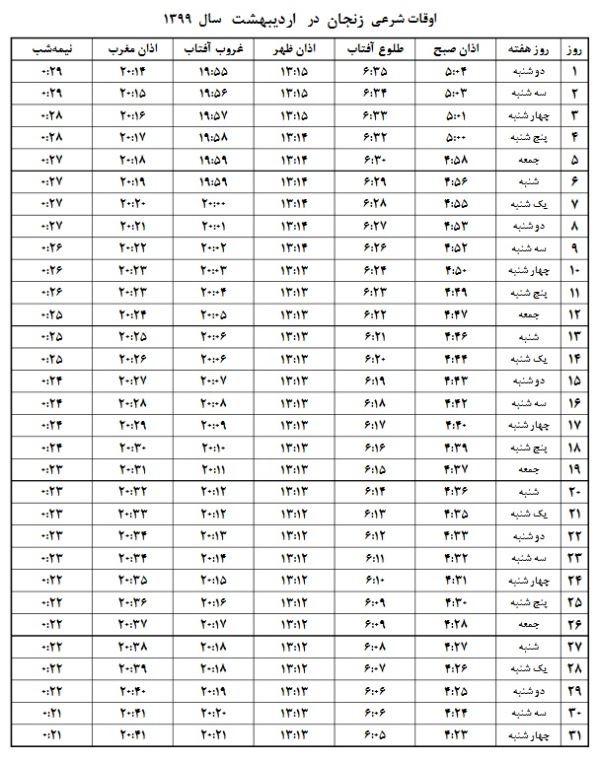 اوقات شرعی ماه رمضان ۹۹ زنجان: