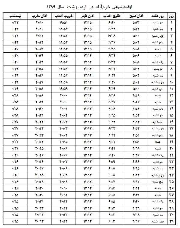 اوقات شرعی ماه رمضان ۹۹ خرم آباد: