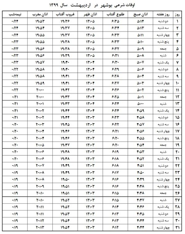 اوقات شرعی ماه رمضان ۹۹ بوشهر: