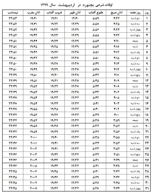 اوقات شرعی ماه رمضان ۹۹ بجنورد: