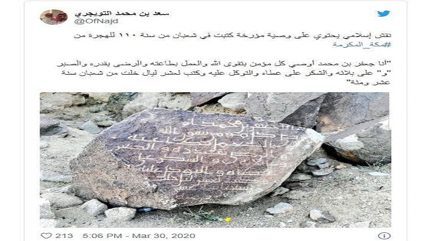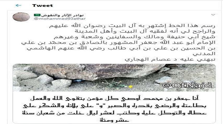 تهران- الکوثر: این سنگنبشته که گفته شده در نزدیکی مکه مکرمه به دست آمده است، تاریخ ۱۰ شعبان ۱۱۰ هجری قمری را بر روی خود دارد و در شبکه های اجتماعی عربستان با عنوان سنگنبشته ی جعفر بن محمد [صادق] علیه السلام دست به دست می چرخد. هنوز دیدگاه منابع رسمی عربستان در این خصوص ندر دست نیست و البته اصالت این تصویر و سنگنبشته باید از سوی کارشناسان مورد بررسی قرار گیرد و شفقنا نمی تواند مستقلا اصالت آن را تایید یا رد نماید.