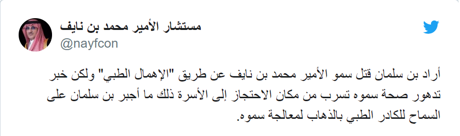 یک حساب توئیتری منتسب به مشاور بن نایف نیز اعلام کرد نیروهای امنیتی سعودی دستپاچه شدهاند و ما مطمئن هستیم که یک تیم پزشکی به سمت محل نگهداری بن نایف حرکت کرده است.... بن سلمان قصد دارد شاهزاده بن نایف را از طریق رسیدگی نکردن پزشکی به قتل برساند ولی خبر وخامت حال او از محل بازداشتش به گوش اعضای خانواده (سعودی) رسید و بن سلمان مجبور شد به تیم پزشکی اجازه دهد برای درمان بن نایف راهی شود.