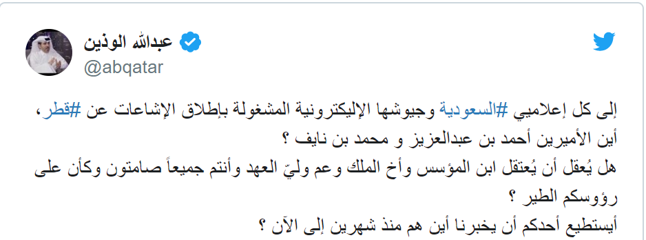 «عبدالله الوذین» یک نویسنده عرب نیز با انتشار یک پست توئیتری نوشت: اصحاب رسانه در عربستان و فعالان توئیتری به جای آنکه علیه قطر شایعه پردازی کنند بگویند که احمد بن عبدالعزیز و محمد بن نایف، دو شاهزاده سعودی کجا هستند؟ آیا معقول است که برادر پادشاه و عموی ولیعهد بازداشت شده اند و همه شما ساکت هستید؟ آیا کسی از شما می تواند بگوید آنها از دو ماه پیش کجا هستند؟