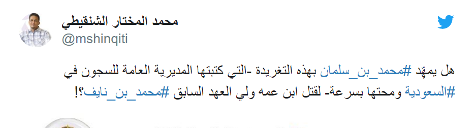 «مختار الشنقیطی» یکی دیگر از فعالان تویئتری نوشت: آیا بن سلمان با توئیتی که مدیرکل زندان های عربستان منتشر و به سرعت آن را حذف کرد به دنبال زمینه سازی برای قتل پسرعمویش ولیعهد سابق عربستان است؟