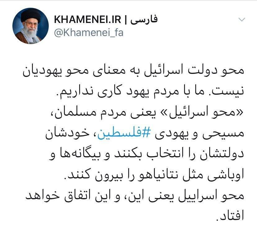 در این توئیت آمده: محو دولت اسرائیل به معنای محو یهودیان نیست. ما با مردم یهود کاری نداریم. محو اسرائیل یعنی مردم مسلمان، مسیحی و یهودی فلسطین، خودشان دولتشان را انتخاب بکنند و بیگانگان و اوباشی مثل نتانیاهو را بیرون کنند. محو اسرائیل یعنی این و این اتفاق خواهد افتاد.