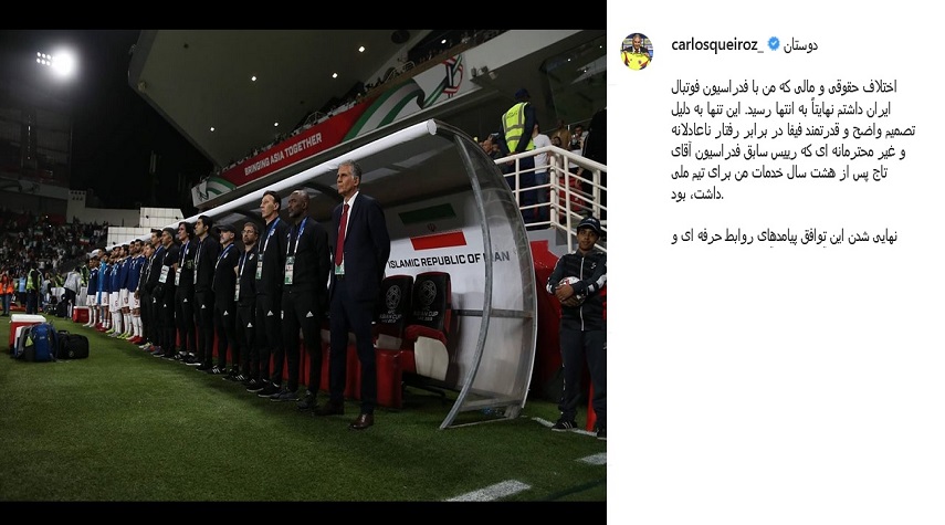 "اختلاف حقوقی و مالی که من با فدراسیون فوتبال ایران داشتم، نهایتا به انتها رسید. این تنها به دلیل تصمیم واضح و قدرتمند فیفا در برابر رفتار ناعادلانه و غیر محترمانه ای که رئیس سابق فدراسیون، آقای مهدی تاج پس از 8 سال خدمات من برای تیم ملی داشت، بود.
