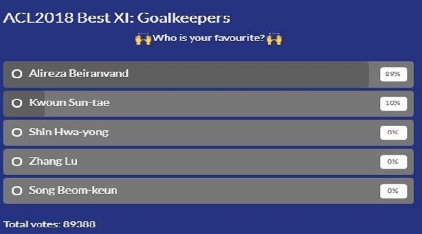 با پایان مهلت شرکت در این نظرسنجی، علیرضا بیرانوند با کسب 89 درصد آرا به عنوان بهترین دروازهبان این دوره از رقابتها انتخاب شد.