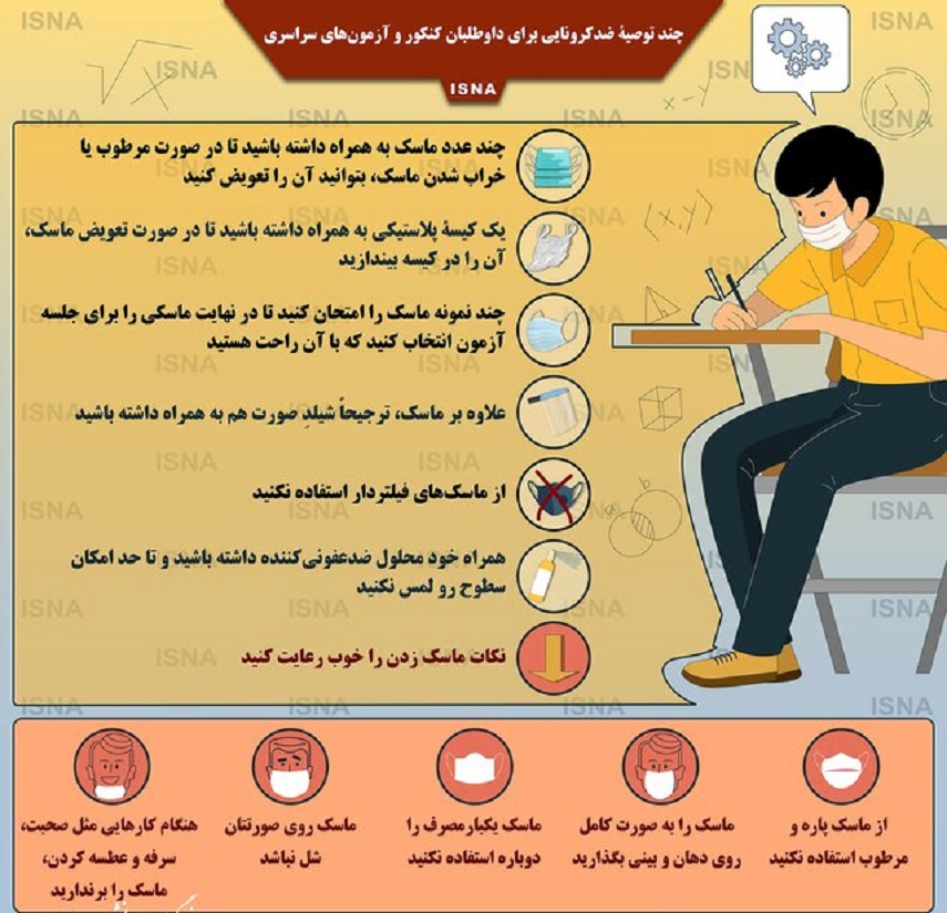 به گزارش پایگاه شبکه الکوثر، با وجود برخی درخواستها برای تعویق کنکورهای امسال از جمله کنکور دکتری، کنکور کارشناسی ارشد و کنکور سراسری به دلیل شیوع کرونا، این مطالبه مورد موافقت قرار نگرفت و داوطلبان باید در سر جلسات این آزمونها حاضر شوند. به همین منظور در این اینفوگرافیک توصیههایی برای داوطلبان شرکت در این آزمونها مطرح شده است تا در کنار نکاتی که اعلامشده باید برگزارکنندگان آزمونها رعایت کنند، احتمال ابتلای شرکتکنندگان به ویروس کرونا به حداقل برسد.
