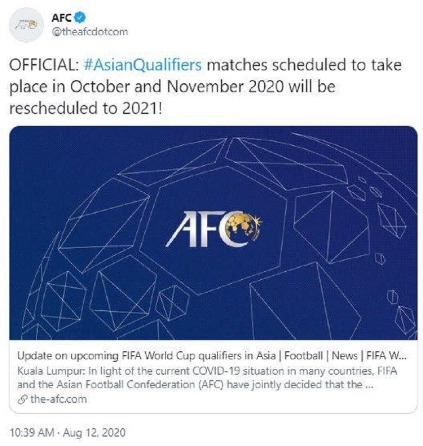 در بیانیه AFC آماده است: در شرایط کنونی شیوع فراگیر ویروس کرونا فیفا و فدراسیون جهانی فوتبال با تصمیم مشترک به این نتیجه رسیدند تا مسابقات انتخابی جام جهانی ۲۰۲۲ قرار بود در ماه های اکتبر و نوامبر(مهر و آبان) برگزار شود به سال ۲۰۲۱ موکول شد.