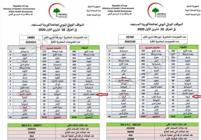همانگونه که در آمار ارائهشده "وزارت بهداشت عراق" در این جدول قابل مشاهده است، تعداد فوتیهای بیماران مبتلا به کرونا در کربلا "صفر" و در شهر نجف اشرف فقط "یک" نفر بوده است.