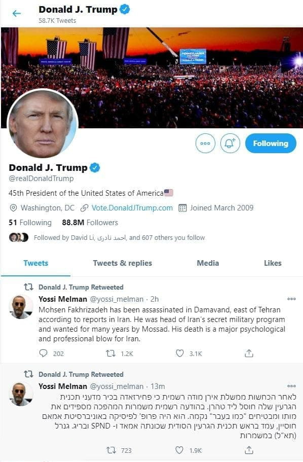 دونالد ترامپ رئیسجمهور آمریکا توییت یک خبرنگار صهیونیست را بازنشر کرد که نوشته بود: «بر اساس گزارشها در ایران محسن فخری زاده در دماوند، در شرق تهران ترور شدهاست. موساد سالها به دنبال او بودهاست».
