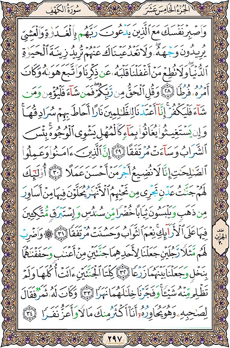 و همیشه خویش را با کمال شکیبایی به محبت آنان که صبح و شام خدای خود را میخوانند و رضای او را میطلبند وادار کن، و مبادا دیدگانت از آنان بگردد از آن رو که به زینتهای دنیا مایل باشی، و هرگز از آن که ما دل او را از یاد خود غافل کردهایم و تابع هوای نفس خود شده و به تبهکاری پرداخته متابعت مکن. (28)
