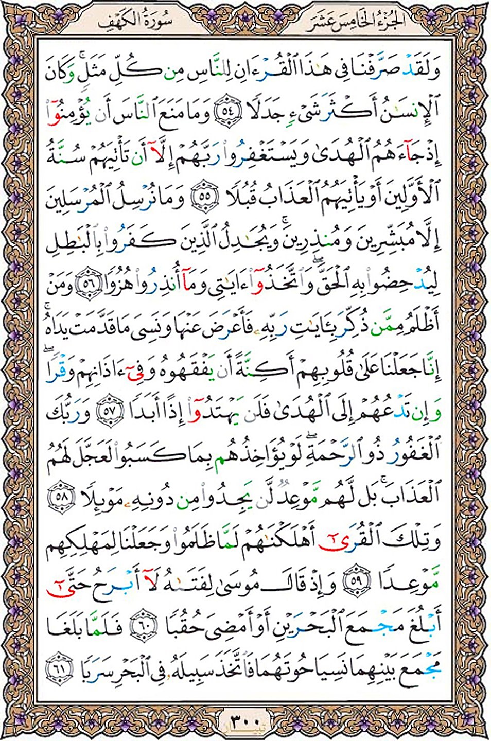 و گردش آفتاب را چنان مشاهده میکنی که هنگام طلوع از سمت راست غار آنها برکنار و هنگام غروب نیز از جانب چپ ایشان به دور میگردد و آنها در فضای گسترده غار قرار دارند (و کاملاً از حرارت خورشید در آسایشند). این حکایت جوانمردان کهف یکی از آیات الهی است هر کس را خدا راهنمایی کند او به حقیقت هدایت یافته و هر که را در گمراهی واگذارد دیگر هرگز برای چنین کس هیچ یار راهنمایی نخواهی یافت. (17)