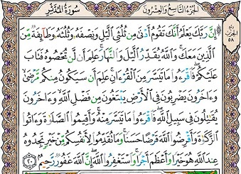 خدا به حال تو آگاه است که تو و جمعی هم از آنان که با تواند (اغلب) نزدیک دو ثلث یا نصف یا (لا اقل) ثلث شب را همیشه به طاعت و نماز میپردازید، و خدا (گردش) شب و روز را مقدّر میکند، خدا میداند که شما هرگز تمام ساعات شب را (به عبادت) ضبط نخواهید کرد لذا از شما (اوقات خواب و کارهای دیگر را) در گذشت تا هر چه (از شب را بیمشقت و) آسان است به تلاوت قرآن پردازید. خدا بر احوال شما آگاه است که برخی مریض و ناتوانند و برخی به سفر از کرم خدا روزی میطلبند و برخی در راه خدا به جنگ و جهاد مشغولند، پس در هر حال آنچه میسّر و آسان باشد به قرائت قرآن پردازید و نماز به پا دارید و زکات مالتان (به فقیران) بدهید و به خدا قرض نیکو دهید (یعنی برای خدا به محتاجان احسان کنید و قرض الحسنه دهید)، و هر عمل نیک برای آخرت خود پیش فرستید (پاداش) آن را البته نزد خدا بیابید و آن اجر و ثواب آخرت (که بهشت ابد است، از متاع دنیا) بسی بهتر و بزرگتر است، و دایم از خدا آمرزش طلبید که خدا بسیار آمرزنده و مهربان است. (۲۰)