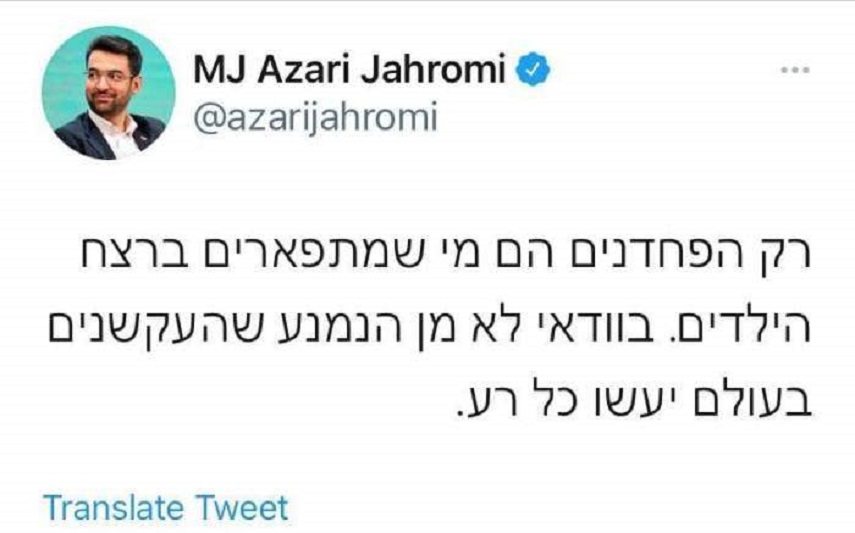 به گزارش پایگاه شبکه الکوثر، محمدجواد آذری جهرمی، وزیر ارتباطات وفناوری اطلاعات ایران در توییتر نوشت: "فقط بزدلها به کودک کشی افتخار میکنند. البته از رژیم نامردان عالم هیچ چیز بعید نیست".