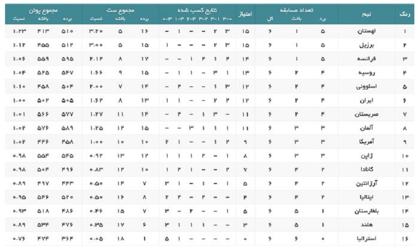علاوه بر ایران، تیمهای آرژانتین، آلمان، فرانسه، برزیل، لهستان، آمریکا و ایتالیا هم در روز ششم مسابقات حریفان خود را شکست دادند.