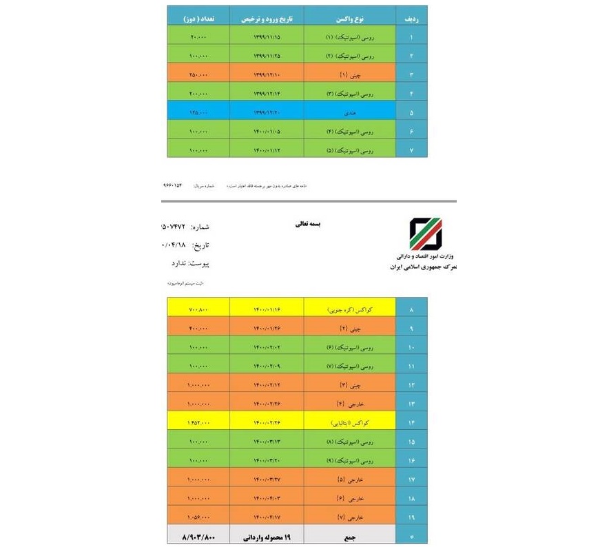 به گزارش پایگاه شبکه الکوثر، گمرک ایران اعلام کرد، از تاریخ ۱۳۹۹/۱۱/۱۵ لغایت ۱۴۰۰/۰۴/۱۸، ۱۹ محموله واکسن کووید-19 به شرح ذیل از طریق فرودگاه امام خمینی(ره) وارد کشور شده است.