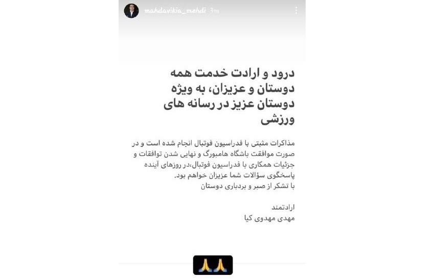 مهدی مهدویکیا که پس از اعلام این خبر سکوت کرده بود، اولین واکنش رسمی خود را نسبت به این خبر اعلام کرد و خطاب به دوستانش و همچنین رسانهها در صفحه شخصی خود در اینستاگرام نوشت: «مذاکرات مثبتی با فدراسیون فوتبال انجام شده است و در صورت موافقت باشگاه هامبورگ و نهایی شدن توافقات و جزئیات همکاری با فدراسیون فوتبال، در روزهای آینده پاسخگوی سؤالات شما عزیزان خواهم بود».
