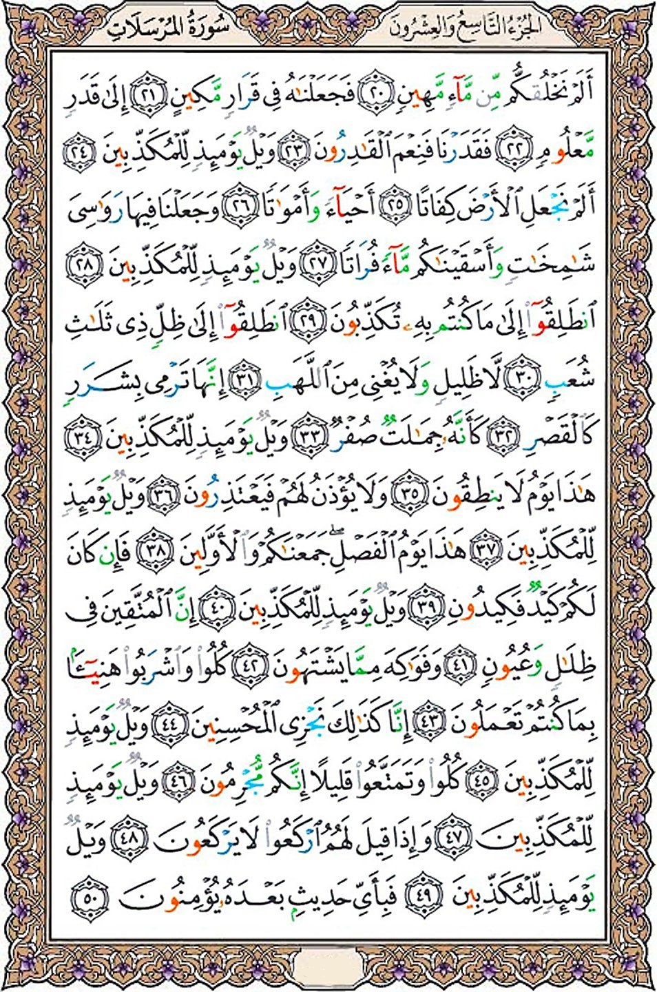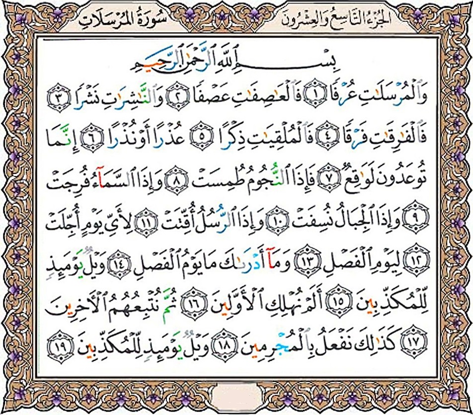 سوگند به فرستادگان پىدرپى، (۱) كه سخت توفندهاند. (۲) و سوگند به افشانندگان افشانگر، (۳) كه [ميان حق و باطل] جداگرند، (۴) و القاكننده وحىاند. (۵) خواه عذرى باشد يا هشدارى. (۶) كه آنچه وعده يافتهايد قطعاً رخ خواهد داد. (۷) پس وقتى كه ستارگان محو شوند، (۸) و آنگاه كه آسمان بشكافد، (۹) و آنگاه كه كوهها از جا كنده شوند، (۱۰) و آنگاه كه پيمبران به ميقات آيند، (۱۱) براى چه روزى تعيين وقت شده است؟ (۱۲) براى روز داورى. (۱۳) و تو چه دانى كه روز داورى چيست؟ (۱۴) آن روز واى بر تكذيبكنندگان! (۱۵) مگر پيشينيان را هلاك نكرديم؟ (۱۶) سپس از پى آنان پسينيان را مىبريم. (۱۷) با مجرمان چنين مىكنيم. (۱۸) آن روز واى بر تكذيبكنندگان. (۱۹) مگر شما را از آبى بىمقدار نيافريديم؟ (۲۰) پس آن را در جايگاهى استوار نهاديم، (۲۱) تا مدّتى معيّن! (۲۲) و توانا آمديم، و چه نيك تواناييم. (۲۳) آن روز واى بر تكذيبكنندگان. (۲۴) مگر زمين را محل اجتماع نگردانيديم؟ (۲۵) چه براى مردگان چه زندگان. (۲۶) و كوههاى بلند در آن نهاديم و به شما آبى گوارا نوشانيديم. (۲۷) آن روز واى بر تكذيبكنندگان. (۲۸) برويد به سوى همان چيزى كه آن را تكذيب مىكرديد. (۲۹) برويد به سوى [آن] دود سه شاخه، (۳۰) نه سايهدار است و نه از شعله [آتش] حفاظت مىكند. (۳۱) [دوزخ] چون كاخى [بلند] شراره مىافكند، (۳۲) گويى شترانى زرد رنگند. (۳۳) آن روز واى بر تكذيبكنندگان. (۳۴) اين، روزى است كه دم نمىزنند. (۳۵) و رخصت نمىيابند تا پوزش خواهند. (۳۶) آن روز واى بر تكذيبكنندگان. (۳۷) اين [همان] روز داورى است شما و [جمله] پيشينيان را گرد مىآوريم. (۳۸) پس اگر حيلتى داريد، در برابر من بسگاليد. (۳۹) آن روز واى بر تكذيبكنندگان. (۴۰) اهل تقوا در زير سايهها و بر كنار چشمهسارانند، (۴۱) با هر ميوهاى كه خوش داشته باشند. (۴۲) به [پاداش] آنچه مىكرديد، بخوريد و بياشاميد؛ گواراتان باد. (۴۳) ما نيكوكاران را چنين پاداش مىدهيم. (۴۴) آن روز واى بر تكذيبكنندگان. (۴۵) [اى كافران،] بخوريد و اندكى برخوردار شويد كه شما گناهكاريد. (۴۶) [ولى] آن روز واى بر تكذيبكنندگان. (۴۷) و چون به آنان گفته شود: «ركوع كنيد»، به ركوع نمىروند. (۴۸) آن روز واى بر تكذيبكنندگان. (۴۹) پس به كدامين سخن پس از [قرآن] ايمان مىآورند؟ (۵۰)