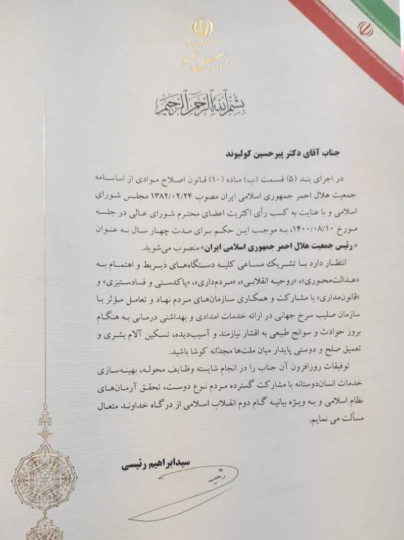 پیرحسین کولیوند در دورهای رئیس سازمان امداد و نجات جمعیت هلال احمر بود و با حکم جدید، با عنوان رئیس جمعیت هلال احمر به ساختمان صلح خواهد رفت.