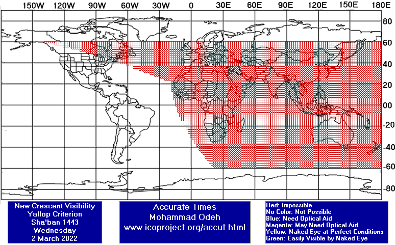 در مناطقی که در رنگ قرمز قرار دارند، رؤیت هلال ممتنع و غیر قابل تحقّق است. (زیرا ماه پیش از غروب آفتاب، غروب میکند یا اینکه مقارنه پس از غروب آفتاب رخ میدهد.)