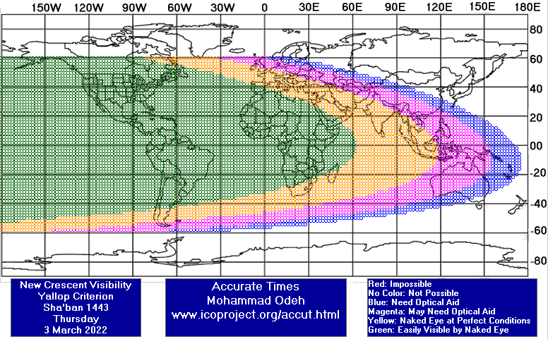 نقشۀ یک: نقشۀ رؤیتپذیری هلال ماه شعبان ۱۴۴۳ قمری، در غروب چهارشنبه ۱۱ اسفند ۱۴۰۰ شمسی برابر با ۲ مارس ۲۰۲۲ میلادی، بر اساس معیار «یالوپ»: