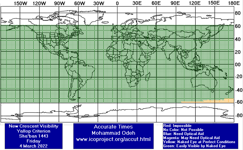 نقشۀ سه: نقشۀ رؤیتپذیری هلال ماه شعبان ۱۴۴۳ قمری، در غروب جمعه ۱۳ اسفند ۱۴۰۰ شمسی برابر با ۴ مارس ۲۰۲۲ میلادی، بر اساس معیار «یالوپ»: