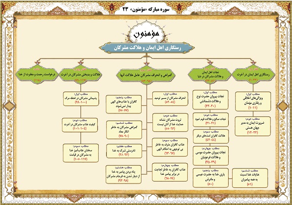 به راستى كه مؤمنان رستگار شدند، (۱) همانان كه در نمازشان فروتنند، (۲) و آنان كه از بيهوده رويگردانند، (۳) و آنان كه زكات مىپردازند، (۴) و كسانى كه پاكدامنند، (۵) مگر در مورد همسرانشان يا كنيزانى كه به دست آوردهاند، كه در اين صورت بر آنان نكوهشى نيست. (۶) پس هر كه فراتر از اين جويد، آنان از حد درگذرندگانند. (۷) و آنان كه امانتها و پيمان خود را رعايت مىكنند، (۸) و آنان كه بر نمازهايشان مواظبت مىنمايند، (۹) آنانند كه خود وارثانند، (۱۰) همانان كه بهشت را به ارث مىبرند و در آنجا جاودان مىمانند. (۱۱) و به يقين، انسان را از عصارهاى از گِل آفريديم. (۱۲) سپس او را [به صورت] نطفهاى در جايگاهى استوار قرار داديم. (۱۳) آنگاه نطفه را به صورت علقه درآورديم. پس آن علقه را [به صورت] مضغه گردانيديم، و آنگاه مضغه را استخوانهايى ساختيم، بعد استخوانها را با گوشتى پوشانيديم، آنگاه [جنين را در] آفرينشى ديگر پديد آورديم. آفرين باد بر خدا كه بهترين آفرينندگان است. (۱۴) بعد از اين [مراحل] قطعاً خواهيد مُرد. (۱۵) آنگاه شما در روز رستاخيز برانگيخته خواهيد شد. (۱۶) و به راستى [ما] بالاى سر شما هفت راه [آسمانى] آفريديم و از [كار] آفرينش غافل نبودهايم. (۱۷)و از آسمان، آبى به اندازه [معيّن] فرود آورديم، و آن را در زمين جاى داديم، و ما براى از بين بردن آن مسلّماً تواناييم. (۱۸) پس براى شما به وسيله آن باغهايى از درختان خرما و انگور پديدار كرديم كه در آنها براى شما ميوههاى فراوان است و از آنها مىخوريد. (۱۹) و از طور سينا درختى برمىآيد كه روغن و نان خورشى براى خورندگان است. (۲۰) و البته براى شما در دامها[ى گلّه درس] عبرتى است: از [شيرى] كه در شكم آنهاست، به شما مىنوشانيم، و براى شما در آنها سودهاى فراوان است و از آنها مىخوريد. (۲۱) و بر آنها و بر كشتيها سوار مىشويد. (۲۲) و به يقين نوح را به سوى قومش فرستاديم. پس [به آنان] گفت: «اى قوم من، خدا را بپرستيد. شما را جز او خدايى نيست. مگر پروا نداريد؟» (۲۳) و اشراف قومش كه كافر بودند گفتند: «اين [مرد] جز بشرى چون شما نيست، مىخواهد بر شما برترى جويد، و اگر خدا مىخواست قطعاً فرشتگانى مىفرستاد. [ما]در ميان پدران نخستين خود، چنين [چيزى] نشنيدهايم.» (۲۴) او نيست جز مردى كه در وى [حال] جنون است، پس تا چندى در بارهاش دست نگاه داريد. (۲۵) [نوح] گفت: «پروردگارا، از آن روى كه دروغزنم خواندند مرا يارى كن.» (۲۶) پس به او وحى كرديم كه: زير نظر ما و [به] وحى ما كشتى را بساز، و چون فرمان ما دررسيد و تنور به فوران آمد، پس در آن از هر نوع [حيوانى] دو تا [يكى نر و ديگرى ماده] با خانوادهات -بجز كسى از آنان كه حكم [عذاب ] بر او پيشى گرفته است- وارد كن، در باره كسانى كه ظلم كردهاند با من سخن مگوى، زيرا آنها غرق خواهند شد. (۲۷) و چون تو با آنان كه همراه تواند بر كشتى نشستى بگو: «ستايش خدايى را كه ما را از [چنگ] گروه ظالمان رهانيد.» (۲۸) و بگو: «پروردگارا، مرا در جايى پربركت فرود آور [كه] تو نيكترين مهماننوازانى.» (۲۹) در حقيقت، در اين [ماجرا] عبرتهايى است، و قطعاً ما آزمايشكننده بوديم. (۳۰) سپس، بعد از آنان نسل[هايى] ديگر پديد آورديم. (۳۱) و در ميانشان پيامبرى از خودشان روانه كرديم كه: خدا را بپرستيد. جز او براى شما معبودى نيست. آيا سرِ پرهيزگارى نداريد؟ (۳۲) و اشراف قومش كه كافر شده، و ديدار آخرت را دروغ پنداشته بودند، و در زندگى دنيا آنان را مرفّه ساخته بوديم گفتند: «اين [مرد] جز بشرى چون شما نيست: از آنچه مىخوريد، مىخورد؛ و از آنچه مىنوشيد، مىنوشد. (۳۳) و اگر بشرى مثل خودتان را اطاعت كنيد در آن صورت قطعاً زيانكار خواهيد بود. (۳۴) آيا به شما وعده مىدهد كه وقتى مُرديد و خاك و استخوان شديد [باز] شما [از گور زنده] بيرون آورده مىشويد؟ (۳۵) وه، چه دور است آنچه كه وعده داده مىشويد. (۳۶) جز اين زندگانى دنياى ما چيزى نيست. مىميريم و زندگى مىكنيم و ديگر برانگيخته نخواهيم شد. (۳۷) او جز مردى كه بر خدا دروغ مىبندد نيست، و ما به او اعتقاد نداريم.» (۳۸) گفت: «پروردگارا، از آن روى كه مرا دروغزن 