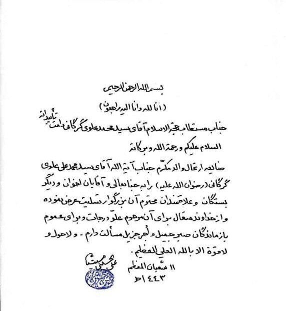 ضایعه ارتحال والد مکرّم جناب آیت الله آقای سیدمحمدعلی علوی گرگانی (رضوان الله علیه) را به جنابعالی و آقایان اخوان و دیگر بستگان و علاقمندان محترم آن بزرگوار تسلیت عرض نموده و از خداوند متعال برای آن مرحوم علّو درجات و برای عموم بازماندگان صبر جمیل و أجر جزیل مسألت دارم.