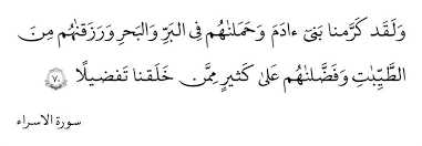 «وَلَقَدْ كَرَّمْنَا بَنِي آدَمَ وَحَمَلْنَاهُمْ فِي الْبَرِّ وَالْبَحْرِ وَ رَزَقْنَاهُم مِّنَ الطَّيِّبَاتِ وَ فَضَّلْنَاهُمْ عَلَىٰ كَثِيرٍ مِّمَّنْ خَلَقْنَا تَفْضِيلًا﴿۷۰﴾»