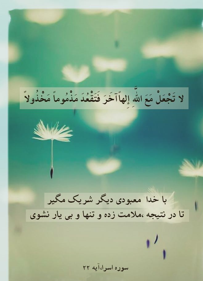 «وَقَضَىٰ رَبُّكَ أَلَّا تَعْبُدُوا إِلَّا إِيَّاهُ وَبِالْوَالِدَيْنِ إِحْسَانًا ۚ إِمَّا يَبْلُغَنَّ عِندَكَ الْكِبَرَ أَحَدُهُمَا أَوْ كِلَاهُمَا فَلَا تَقُل لَّهُمَا أُفٍّ وَلَا تَنْهَرْهُمَا وَقُل لَّهُمَا قَوْلًا كَرِيمًا﴿۲۳﴾ وَاخْفِضْ لَهُمَا جَنَاحَ الذُّلِّ مِنَ الرَّحْمَةِ وَقُل رَّبِّ ارْحَمْهُمَا كَمَا رَبَّيَانِي صَغِيرًا﴿۲۴﴾»