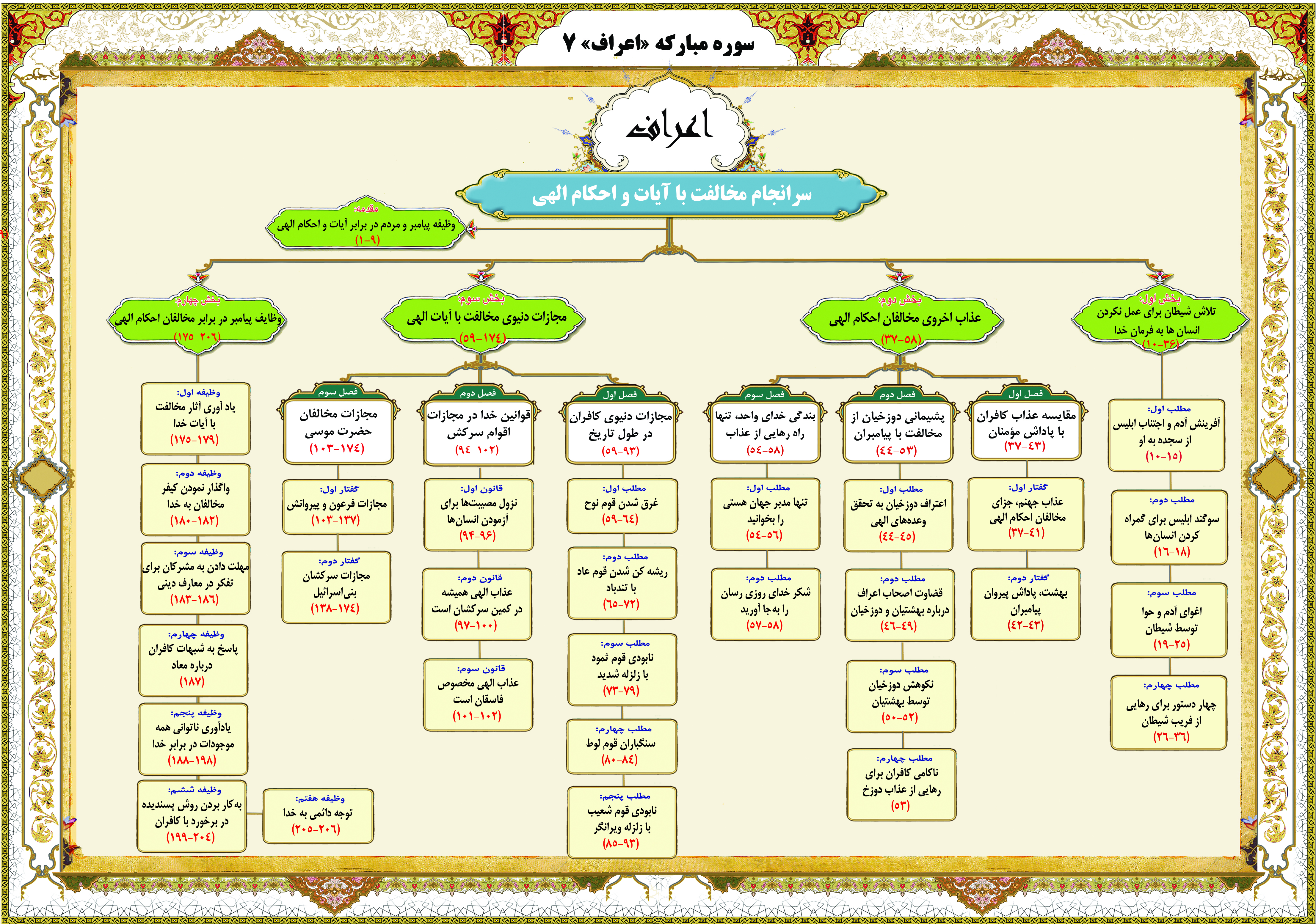 المص ﴿١﴾ كِتَابٌ أُنزِلَ إِلَیكَ فَلَا یكُن فِی صَدْرِكَ حَرَجٌ مِّنْهُ لِتُنذِرَ بِهِ وَذِكْرَىٰ لِلْمُؤْمِنِینَ ﴿٢﴾ اتَّبِعُوا مَا أُنزِلَ إِلَیكُم مِّن رَّبِّكُمْ وَلَا تَتَّبِعُوا مِن دُونِهِ أَوْلِیاءَ ۗ قَلِیلًا مَّا تَذَكَّرُونَ ﴿٣﴾ وَكَم مِّن قَرْیةٍ أَهْلَكْنَاهَا فَجَاءَهَا بَأْسُنَا بَیاتًا أَوْ هُمْ قَائِلُونَ ﴿٤﴾ فَمَا كَانَ دَعْوَاهُمْ إِذْ جَاءَهُم بَأْسُنَا إِلَّا أَن قَالُوا إِنَّا كُنَّا ظَالِمِینَ ﴿٥﴾ فَلَنَسْأَلَنَّ الَّذِینَ أُرْسِلَ إِلَیهِمْ وَلَنَسْأَلَنَّ الْمُرْسَلِینَ ﴿٦﴾ فَلَنَقُصَّنَّ عَلَیهِم بِعِلْمٍ ۖ وَمَا كُنَّا غَائِبِینَ ﴿٧﴾ وَالْوَزْنُ یوْمَئِذٍ الْحَقُّ ۚ فَمَن ثَقُلَتْ مَوَازِینُهُ فَأُولَـٰئِكَ هُمُ الْمُفْلِحُونَ ﴿٨﴾ وَمَنْ خَفَّتْ مَوَازِینُهُ فَأُولَـٰئِكَ الَّذِینَ خَسِرُوا أَنفُسَهُم بِمَا كَانُوا بِآیاتِنَا یظْلِمُونَ ﴿٩﴾ وَلَقَدْ مَكَّنَّاكُمْ فِی الْأَرْضِ وَجَعَلْنَا لَكُمْ فِیهَا مَعَایشَ ۗ قَلِیلًا مَّا تَشْكُرُونَ ﴿١٠﴾ وَلَقَدْ خَلَقْنَاكُمْ ثُمَّ صَوَّرْنَاكُمْ ثُمَّ قُلْنَا لِلْمَلَائِكَةِ اسْجُدُوا لِآدَمَ فَسَجَدُوا إِلَّا إِبْلِیسَ لَمْ یكُن مِّنَ السَّاجِدِینَ ﴿١١﴾قَالَ مَا مَنَعَكَ أَلَّا تَسْجُدَ إِذْ أَمَرْتُكَ ۖ قَالَ أَنَا خَیرٌ مِّنْهُ خَلَقْتَنِی مِن نَّارٍ وَخَلَقْتَهُ مِن طِینٍ ﴿١٢﴾ قَالَ فَاهْبِطْ مِنْهَا فَمَا یكُونُ لَكَ أَن تَتَكَبَّرَ فِیهَا فَاخْرُجْ إِنَّكَ مِنَ الصَّاغِرِینَ ﴿١٣﴾ قَالَ أَنظِرْنِی إِلَىٰ یوْمِ یبْعَثُونَ ﴿١٤﴾ قَالَ إِنَّكَ مِنَ الْمُنظَرِینَ ﴿١٥﴾ قَالَ فَبِمَا أَغْوَیتَنِی لَأَقْعُدَنَّ لَهُمْ صِرَاطَكَ الْمُسْتَقِیمَ ﴿١٦﴾ ثُمَّ لَآتِینَّهُم مِّن بَینِ أَیدِیهِمْ وَمِنْ خَلْفِهِمْ وَعَنْ أَیمَانِهِمْ وَعَن شَمَائِلِهِمْ ۖ وَلَا تَجِدُ أَكْثَرَهُمْ شَاكِرِینَ ﴿١٧﴾ قَالَ اخْرُجْ مِنْهَا مَذْءُومًا مَّدْحُورًا ۖ لَّمَن تَبِعَكَ مِنْهُمْ لَأَمْلَأَنَّ جَهَنَّمَ مِنكُمْ أَجْمَعِینَ ﴿١٨﴾ وَیا آدَمُ اسْكُنْ أَنتَ وَزَوْجُكَ الْجَنَّةَ فَكُلَا مِنْ حَیثُ شِئْتُمَا وَلَا تَقْرَبَا هَـٰذِهِ الشَّجَرَةَ فَتَكُونَا مِنَ الظَّالِمِینَ ﴿١٩﴾ فَوَسْوَسَ لَهُمَا الشَّیطَانُ لِیبْدِی لَهُمَا مَا وُورِی عَنْهُمَا مِن سَوْآتِهِمَا وَقَالَ مَا نَهَاكُمَا رَبُّكُمَا عَنْ هَـٰذِهِ الشَّجَرَةِ إِلَّا أَن تَكُونَا مَلَكَینِ أَوْ تَكُونَا مِنَ الْخَالِدِینَ ﴿٢٠﴾ وَقَاسَمَهُمَا إِنِّی لَكُمَا لَمِنَ النَّاصِحِینَ ﴿٢١﴾ فَدَلَّاهُمَا بِغُرُورٍ ۚ فَلَمَّا ذَاقَا الشَّجَرَةَ بَدَتْ لَهُمَا سَوْآتُهُمَا وَطَفِقَا یخْصِفَانِ عَلَیهِمَا مِن وَرَقِ الْجَنَّةِ ۖ وَنَادَاهُمَا رَبُّهُمَا أَلَمْ أَنْهَكُمَا عَن تِلْكُمَا الشَّجَرَةِ وَأَقُل لَّكُمَا إِنَّ الشَّیطَانَ لَكُمَا عَدُوٌّ مُّبِینٌ ﴿٢٢﴾ قَالَا رَبَّنَا ظَلَمْنَا أَنفُسَنَا وَإِن لَّمْ تَغْفِرْ لَنَا وَتَرْحَمْنَا لَنَكُونَنَّ مِنَ الْخَاسِرِینَ ﴿٢٣﴾ قَالَ اهْبِطُوا بَعْضُكُمْ لِبَعْضٍ عَدُوٌّ ۖ وَلَكُمْ فِی الْأَرْضِ مُسْتَقَرٌّ وَمَتَاعٌ إِلَىٰ حِینٍ ﴿٢٤﴾ قَالَ فِیهَا تَحْیوْنَ وَفِیهَا تَمُوتُونَ وَمِنْهَا تُخْرَجُونَ ﴿٢٥﴾ یا بَنِی آدَمَ قَدْ أَنزَلْنَا عَلَیكُمْ لِبَاسًا یوَارِی سَوْآتِكُمْ وَرِیشًا ۖ وَلِبَاسُ التَّقْوَىٰ ذَٰلِكَ خَیرٌ ۚ ذَٰلِكَ مِنْ آیاتِ اللَّـهِ لَعَلَّهُمْ یذَّكَّرُونَ ﴿٢٦﴾ یا بَنِی آدَمَ لَا یفْتِنَنَّكُمُ الشَّیطَانُ كَمَا أَخْرَجَ أَبَوَیكُم مِّنَ الْجَنَّةِ ینزِعُ عَنْهُمَا لِبَاسَهُمَا لِیرِیهُمَا سَوْآتِهِمَا ۗ إِنَّهُ یرَاكُمْ هُوَ وَقَبِیلُهُ مِنْ حَیثُ لَا تَرَوْنَهُمْ ۗ إِنَّا جَعَلْنَا الشَّیاطِینَ أَوْلِیاءَ لِلَّذِینَ لَا یؤْمِنُونَ ﴿٢٧﴾ وَإِذَا فَعَلُوا فَ