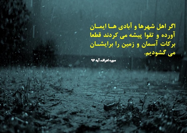 «وَلَوْ أَنَّ أَهْلَ الْقُرَىٰ آمَنُوا وَاتَّقَوْا لَفَتَحْنَا عَلَیهِم بَرَكَاتٍ مِّنَ السَّمَاءِ وَالْأَرْضِ وَلَـٰكِن كَذَّبُوا فَأَخَذْنَاهُم بِمَا كَانُوا یكْسِبُونَ﴿۹۶﴾»