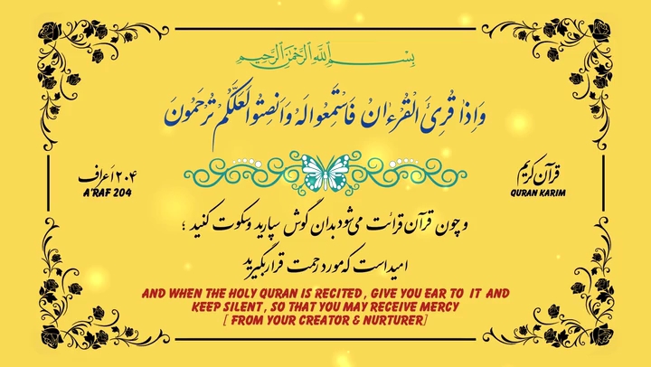 درباره سبب نزول آیه ۲۰۴ سوره اعراف «وَ إِذا قُرِئَ الْقُرْآنُ فَاسْتَمِعُوا لَهُ وَ أَنْصِتُوا؛ چون قرآن خوانده شود به آن گوش فرا دهید و خاموش باشید» آمده است: مسلمانان در نماز جماعت به همراه امام جماعت قرآن میخواندند. آیه فوق نازل شده و دستور به سکوت و توجه به قرائت قرآن توسط امام جماعت داده شد. طبرسی نیز گفته است مسلمانان در زمان نماز صحبت میکردند و زمانی که فردی وارد میشد و سوال میکرد رکعت چندم هستید، پاسخ او را میدادندکه آیه نازل شد و از صحبت کردن در نماز نهی کرد.