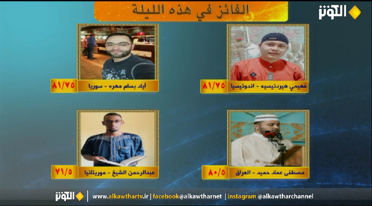 به گزارش پایگاه شبکه الکوثر، بر اساس رأی هیئت داوران ، امتیازات قاریان شرکت کننده در بیست و سومین شب از مسابقات قرآنی رمضانی به شرح زیر است :