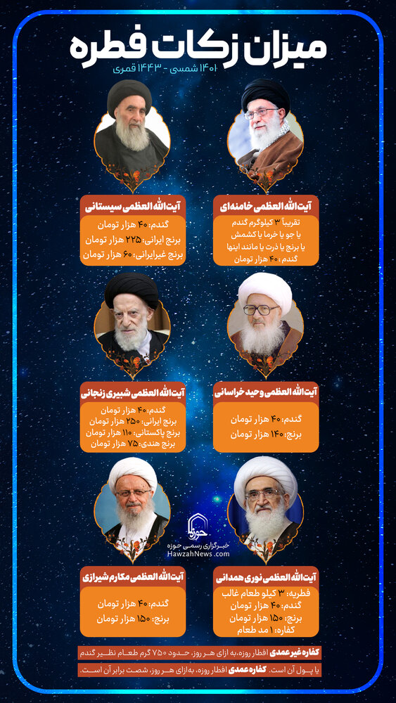 به گزارش پایگاه شبکه الکوثر، مراجع عظام تقلید، نظر خود را درباره مبلغ و مقدار فطریه رمضان ۱۴۰۱ اعلام کردند که به شرح زیر است:
