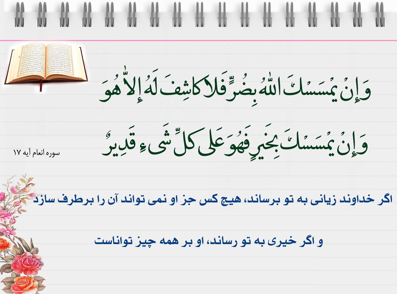 «وَإِن يَمْسَسْكَ اللَّـهُ بِضُرٍّ فَلَا كَاشِفَ لَهُ إِلَّا هُوَ ۖ وَإِن يَمْسَسْكَ بِخَيْرٍ فَهُوَ عَلَىٰ كُلِّ شَيْءٍ قَدِيرٌ ﴿۱۷﴾»