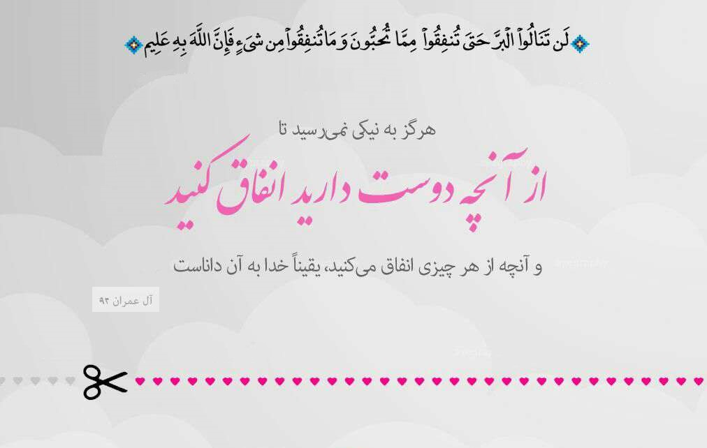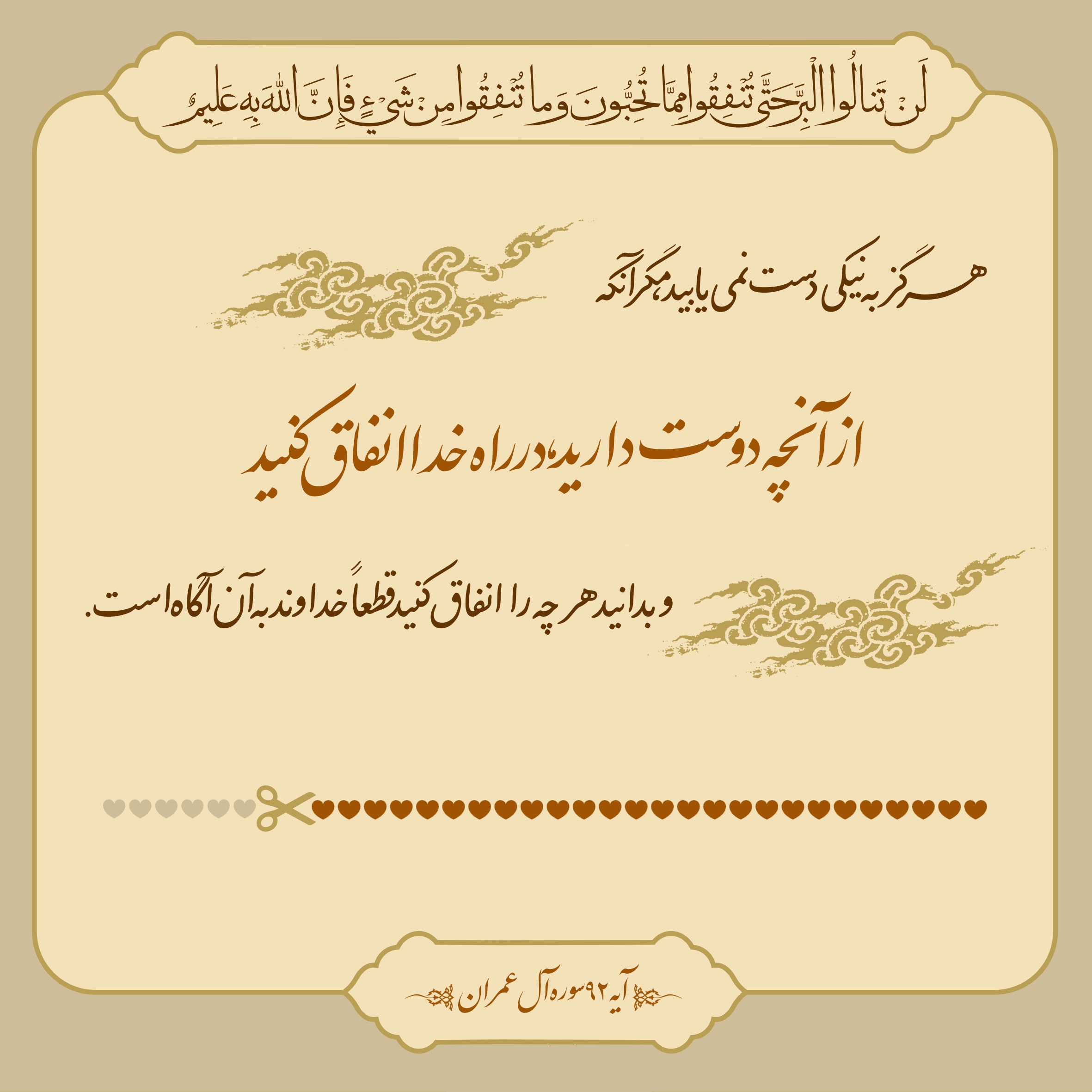«لَن تَنَالُوا الْبِرَّ حَتَّىٰ تُنفِقُوا مِمَّا تُحِبُّونَ ۚ وَمَا تُنفِقُوا مِن شَيْءٍ فَإِنَّ اللَّـهَ بِهِ عَلِيمٌ﴿۹۲﴾»
