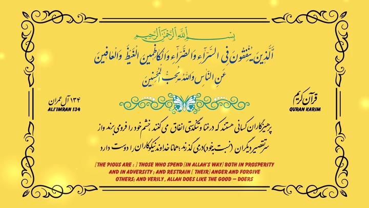 «الَّذِينَ يُنفِقُونَ فِي السَّرَّاءِ وَالضَّرَّاءِ وَالْكَاظِمِينَ الْغَيْظَ وَالْعَافِينَ عَنِ النَّاسِ ۗ وَاللَّـهُ يُحِبُّ الْمُحْسِنِينَ﴿۱۳۴﴾»