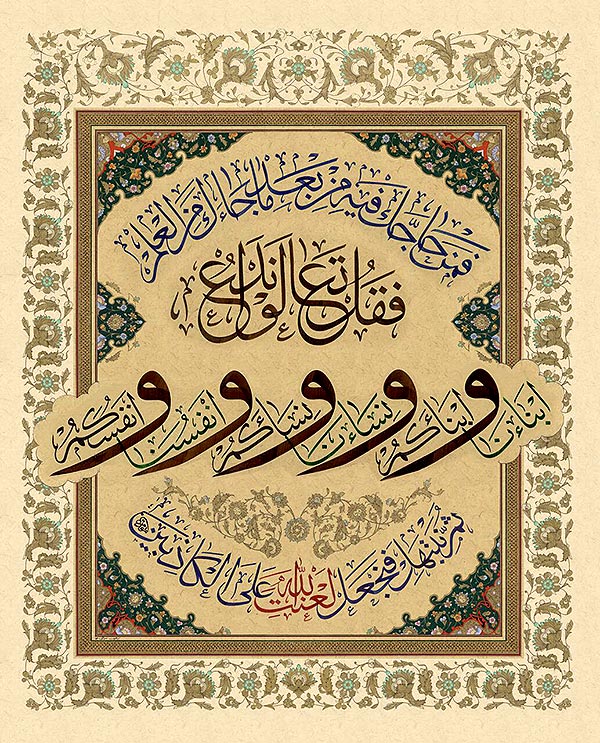 (بنابراین پس از فرارسیدن علم [وحی] به تو، هر کس درباره او [حضرت عیسی(ع)]، با تو به چالش برخیزد، به او بگو: بیایید تا فرزندانمان و فرزندانتان و زنانمان و زنانتان و جانهایمان و جانهایتان را فراخوانیم، آنگاه (به درگاه خداوند) زاری [تضرّع] کنیم تا لعنت خداوند را بر دروغگویان نهیم.)