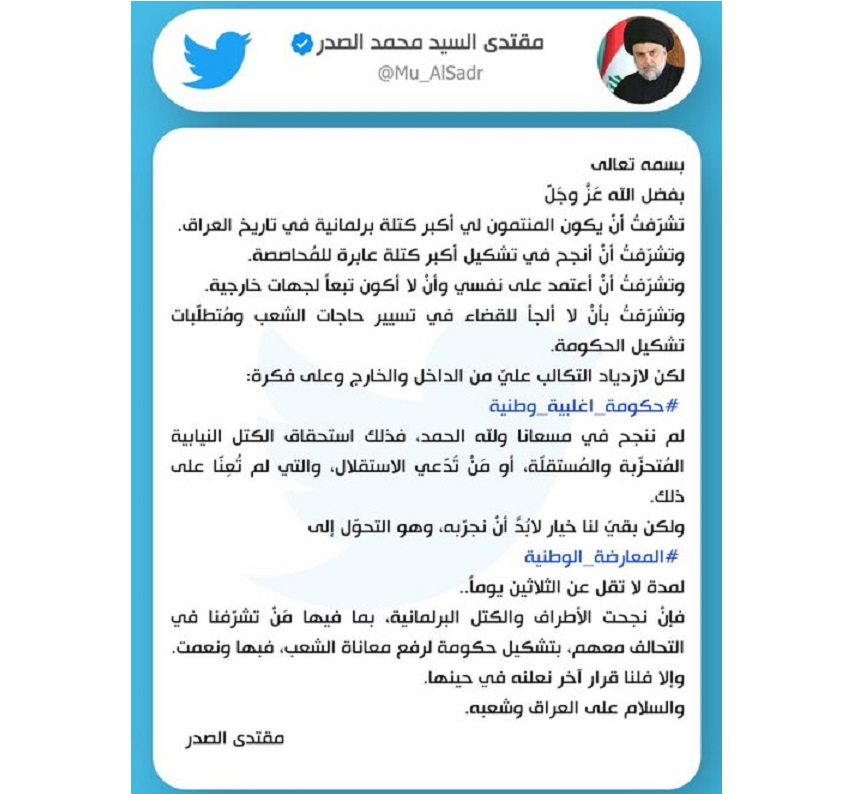 به گزارش پایگاه شبکه الکوثر، "مقتدی صدر" رهبر جریان صدر عراق در صفحه توئیتر خود نوشت: با توجه به رویدادهای پس از انتخابات پارلمانی این کشور، این جریان دست کم به مدت 30 روز به «اپوزیسیون ملی» میپیوندد.