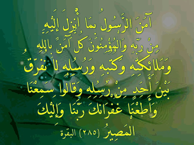 «آمَنَ الرَّسُولُ بِمَا أُنزِلَ إِلَيْهِ مِن رَّبِّهِ وَالْمُؤْمِنُونَ ۚ كُلٌّ آمَنَ بِاللَّـهِ وَمَلَائِكَتِهِ وَكُتُبِهِ وَرُسُلِهِ لَا نُفَرِّقُ بَيْنَ أَحَدٍ مِّن رُّسُلِهِ ۚ وَقَالُوا سَمِعْنَا وَأَطَعْنَا ۖ غُفْرَانَكَ رَبَّنَا وَإِلَيْكَ الْمَصِيرُ ... ﴿۲۸۵﴾»