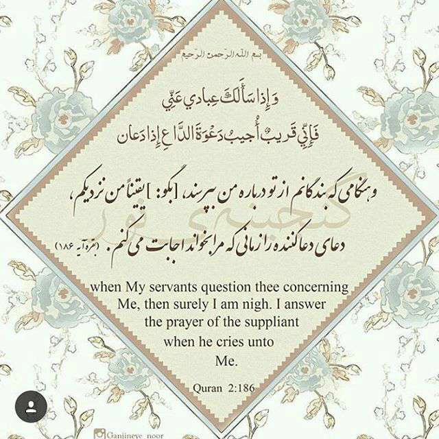 «وَإِذَا سَأَلَكَ عِبَادِي عَنِّي فَإِنِّي قَرِيبٌ ۖ أُجِيبُ دَعْوَةَ الدَّاعِ إِذَا دَعَانِ ۖ فَلْيَسْتَجِيبُوا لِي وَلْيُؤْمِنُوا بِي لَعَلَّهُمْ يَرْشُدُونَ ﴿۱۸۶﴾»