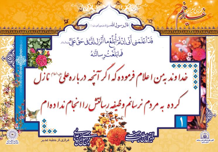 مَعاشِرَالنّاسِ، قُولُوا الَّذی قُلْتُ لَکُمْ وَسَلِّمُوا عَلی عَلی بِإِمْرَةِ الْمُؤْمِنینَ، وَقُولُوا: (سَمِعْنا وَ أَطَعْنا غُفْرانَکَ رَبَّنا وَ إِلَیْکَ الْمَصیرُ)، وَ قُولوا: (اَلْحَمْدُ لِلَّهِ الَّذی هَدانا لِهذا وَ ما کُنّا لِنَهْتَدِی لَوْلا أَنْ هَدانَا الله) الآیة.