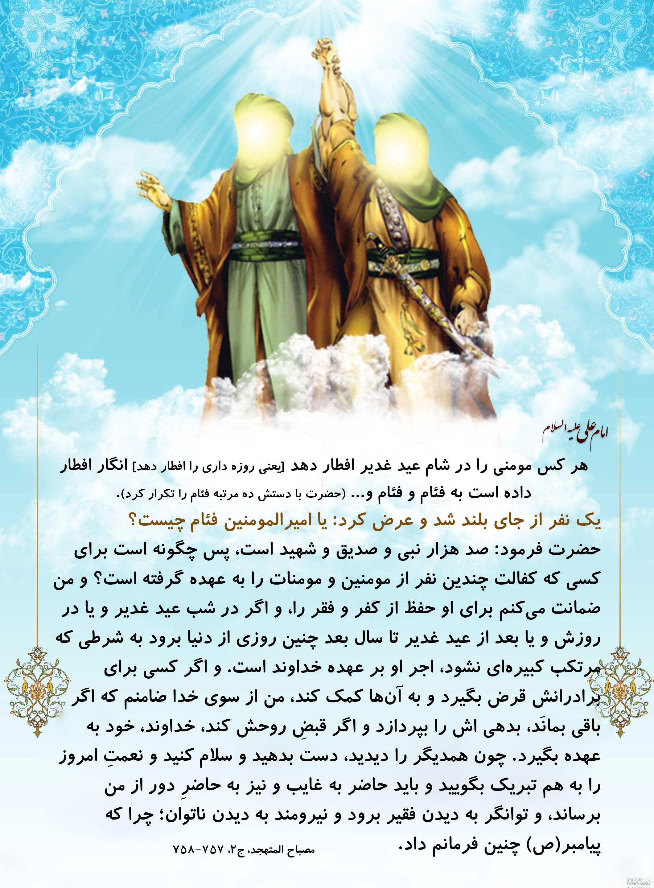 [ی رسول خدا] ما را به فرمان خدا پند دادی درباره ی علی امیرالمؤمنین و امامان از نسل خود و او، که حسن و حسین و آنان که خداوند پس از آنان برپا کرده است. پس عهد و پیمان از ما گرفته شد از دل و جان و زبان و روح و دستانمان. هر کس توانست با دست وگرنه با زبان پیمان بست. و هرگز پیمانمان را دگرگون نخواهیم کرد و خداوند از ما شکست عهد نبیند. و نیز فرمان تو را به نزدیک و دور از فرزندان و خویشان خود خواهیم رسانید و خداوند را بر آن گواه خواهیم گرفت. و هر آینه خداوند بر گواهی کافی است و تو نیز بر ما گواه باش.»